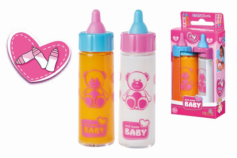 Magische Trinkflaschen – Set aus 2 Flaschen, eine mit „Milch“ und eine mit „Saft“, deren Flüssigkeit beim Füttern an der Puppe wie von Zauberhand verschwindet. Größe 12 cm