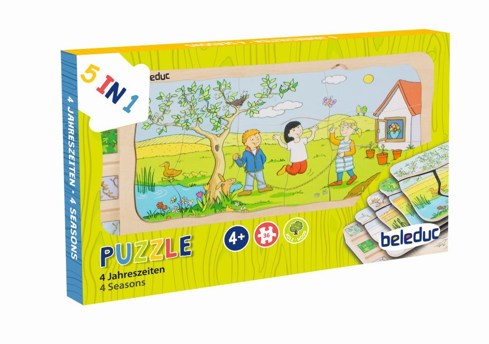 Lagenpuzzle, Tom und Lisa zeigen uns den Wandel der Jahreszeiten. 36 Teile. (Maße: 29 x 14 x 1,8 cm, Holz)