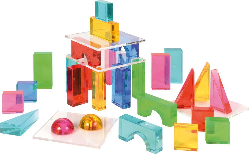 Transparente Bausteine in wunderschön leuchtenden Farben. Die handschmeichelnden Geo Bausteine faszinieren beim Spielen und Bauen durch ihre glänzende Oberfläche und durchscheinende Reflexionen mit tollen Farbeffekten. Mit sechs verschiedenen Formen und vier quadratischen Platten können Kinder transluzente Bauwerke mit mehreren Ebenen gestalten.