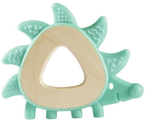 In Form eines Igels. Aus Holz mit natürlichem Kautschuk überzogen, mit verschiedenen Oberflächenstrukturen zur Massage des Zahnfleisches. Größe: 19 x 2 cm.
