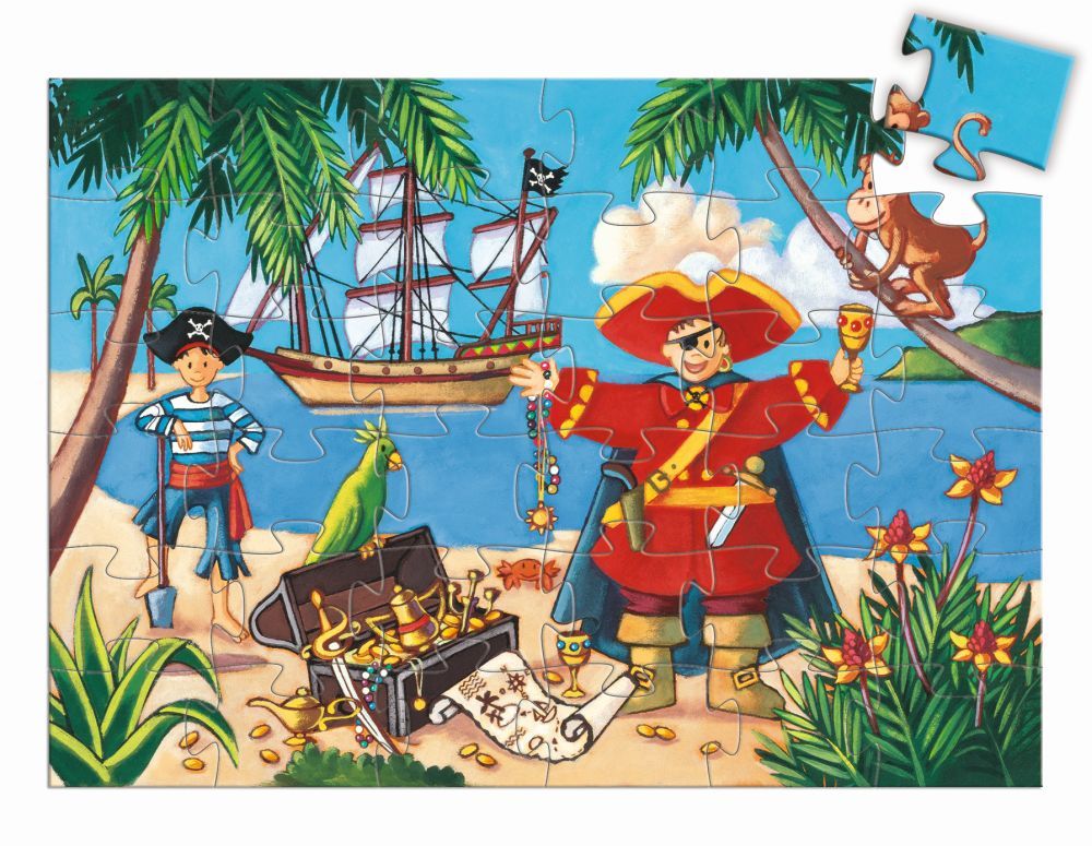 36 Teile, Puzzle – Silhouette Karton,  42x30cm, das Puzzle selbst ist klassisch rechteckig und zeigt den Piraten nach einer erfolgreichen Schatzsuche.