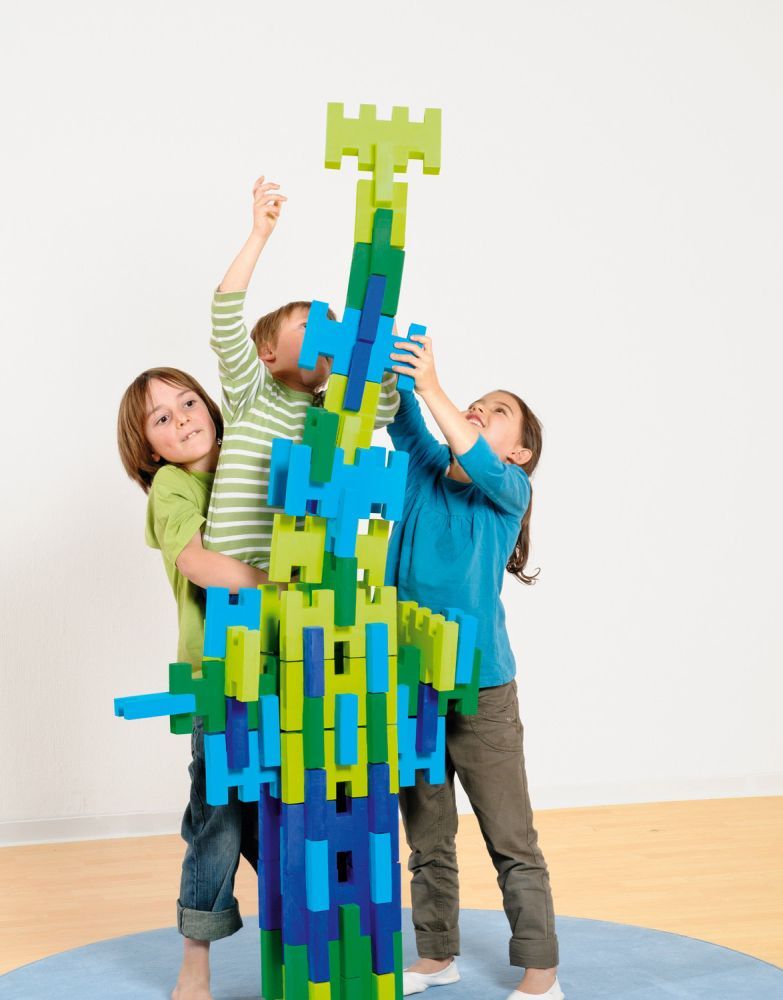 60 Teile, davon 40 Grundbausteine und 20 H-Steine in je 4 Farben aus leichtem, Schaumstoff, abwischbar. Maße: Grundbaustein 21 x 12 cm, H-Stein 9 x 12 cm.