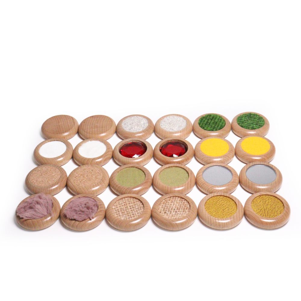 12 Materialpaare mit unterschiedlichen taktilen Oberflächen. Klassisches Memo-Prinzip. Verpackt im Baumwollbeutel. (Inhalt: 24 Holzscheiben dm 5 cm)