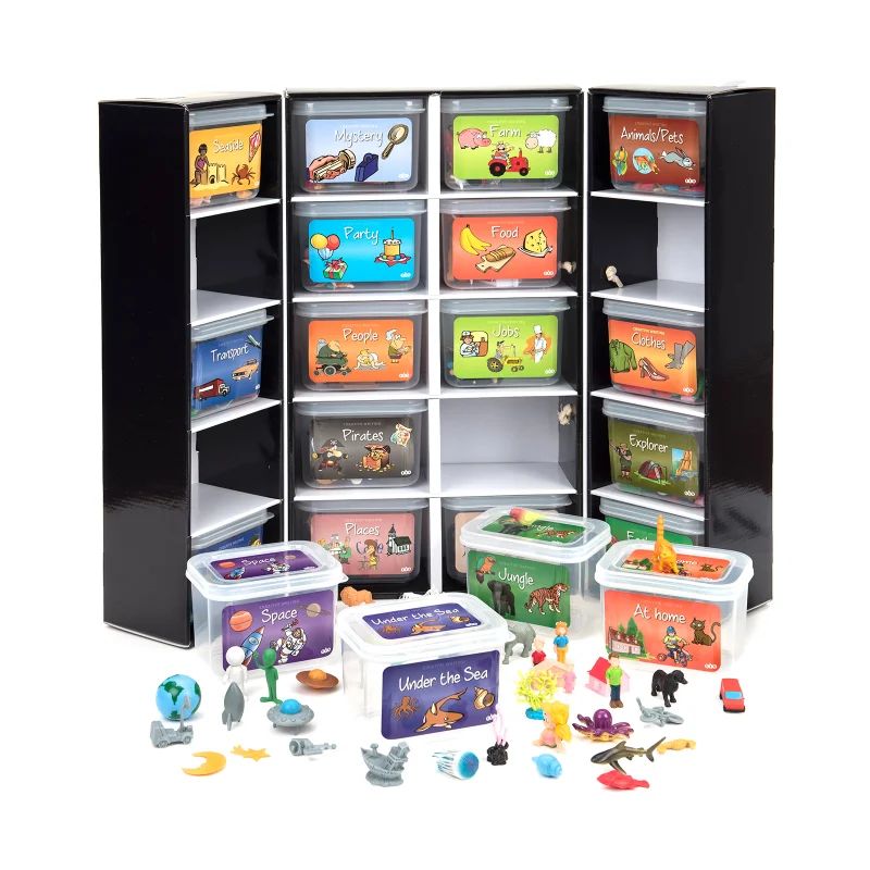 Diese einzigartigen Themenboxen enthalten sorgfältig ausgewählte Objekte, Figuren und Gegenstände, die als Geschichtenauslöser fungieren. Jede der 20 Boxen ist einem spezifischen Thema gewidmet und bietet konkrete Anknüpfungspunkte für Erzählungen. Die Kinder können die Gegenstände anfassen, betrachten und damit experimentieren – so entstehen ganz natürlich Geschichten, die ihre eigenen Erfahrungen und Fantasien widerspiegeln.