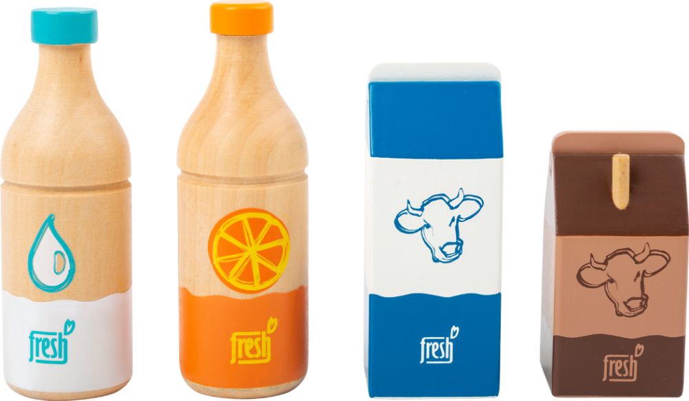 Set aus: 1 Milchtüte, 1 Wasserflasche, 1 Orangensaftflasche, 1 Kakao. (Maße: Flasche Höhe: ca. 12 cm, Ø ca. 4 cm, Kakao ca. 4 x 3,5 x 8 cm, Material: Holz)