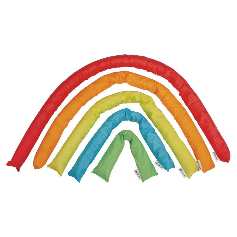 Bunte Gewichtsschlangen in 5 verschiedenen Gewichten und Längen. (Inhalt: 5 Stk., Maße: 40, 60, 80, 100, 120 x 5 cm, Gewicht: 0,8 – 2,5 kg, Material: Oxford, Tonperlen)