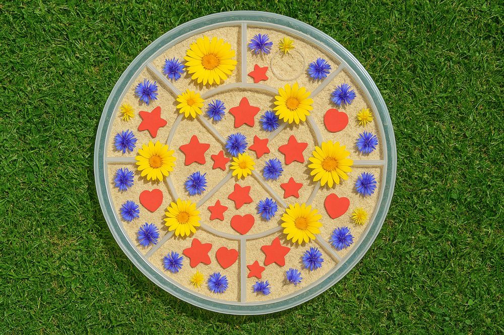 Lege-Mandala, aus einem Teller mit Steckschienen. (Inhalt: 1 Teller, 16 gerade u. 8 gebogene Steckschienen, Kreisformen. Maße: dm 45 x 4 cm, Material: Kunststoff)