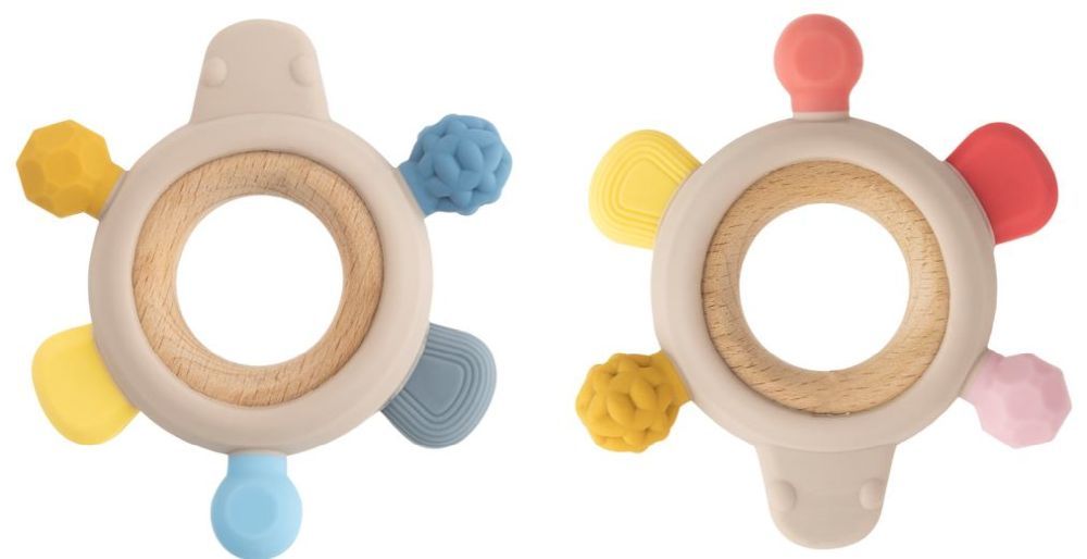 2 Stück Beißringe mit verschiedenen Oberflächen für die sanfte Massage des Zahnfleisches. Abnehmbarer Holzring für eine hygienische Reinigung. Größe: ca. 10 cm.