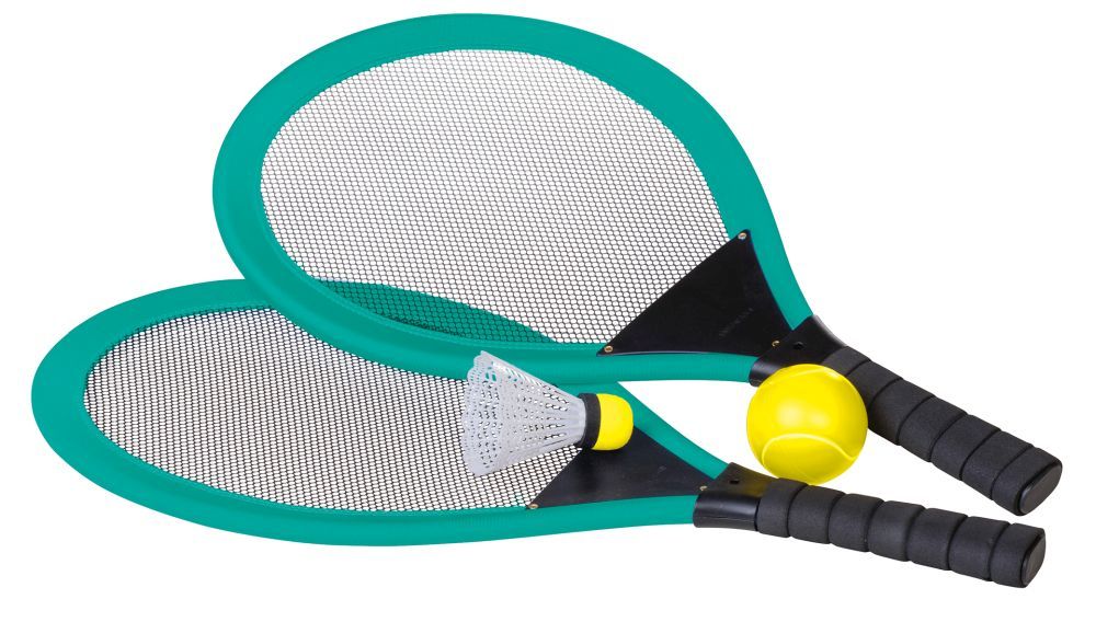 Set aus: 2 Schläger, Größe: ca. 54x27cm, 1 PU-Ball ca. 6,3 cm, 1 Federball ca. 10 cm