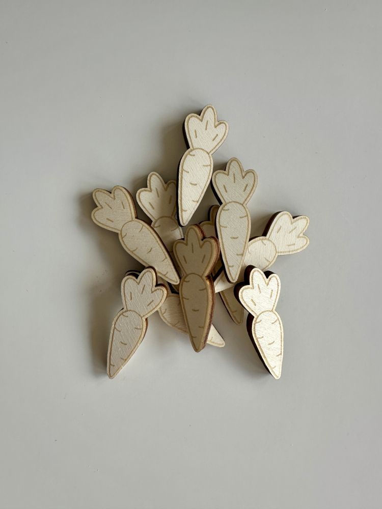 Material: Holz, Maße: Länge – 5,5 cm, Das Set beinhaltet 10 Karotten. Um unseren Osterhasen oder unsere Bauernhoftiere artgerecht zu füttern.