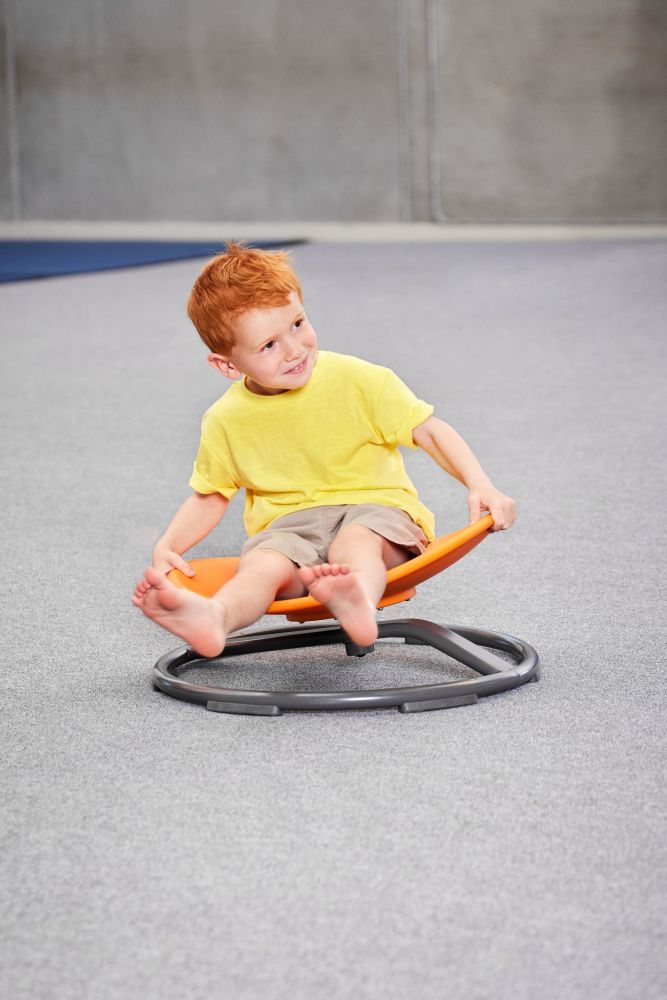 Spannendes, orangefarbenes Karussell, mit dem Kinder sichrichtig drehen können, indem sie den angewinkelten Sitz durchGewichtsverlagerung in Bewegung bringen. Kleine Kinderbewegen den Sitz, indem sie sich mit den Füßen abstoßen.Der dicke Sitzrand bietet einen guten Halt zum Festhalten.Das Spielen mit dem Karussell entwickelt Muskelspannungund -kräftigung. Der Gleichgewichtssinn in Verbindung mit der Sehachse beim Drehen unterstützt die Balancefähigkeit. Der stabile, ausgeformte Kunststoff-Sitz sitzt auf einer Stahlscheibe,die mit einer Rotationsachse mit zwei Kugellagern verbundenist. Das standsichere Metallgestell mit Gummifüßen garantiertsicheres Drehen und Kreisen mit dem Karussell.