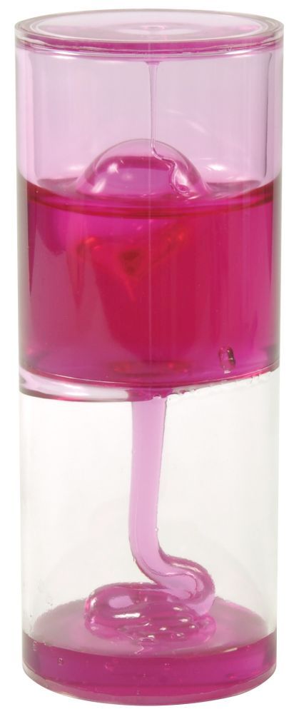 Umdrehen und staunen – wie die pinkfarbene, geleeartige Flüssigkeit langsam durch das Loch in die zweite Hälfte des Zylinders gleitet und spiralförmig den Boden bedeckt. So kann Schwerkraft sichtbar begeistern. Innerhalb von ca. 7 Minuten ist das faszinierende und beruhigende Schauspiel beendet. Hin und wieder steigt durch den Austausch eine Luftblase im oberen Hohlkörper auf.