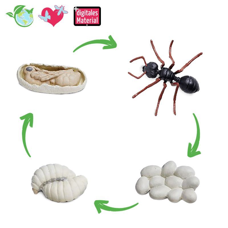 4 Stk. detailgetreue Modelle aller Entwicklungsstadien (Maße: Eier ca. 1 cm, Larven ca. 3,5 cm, Puppe ca. 5,5 cm, Ameise ca. 7 cm), mit digitalen Übungen