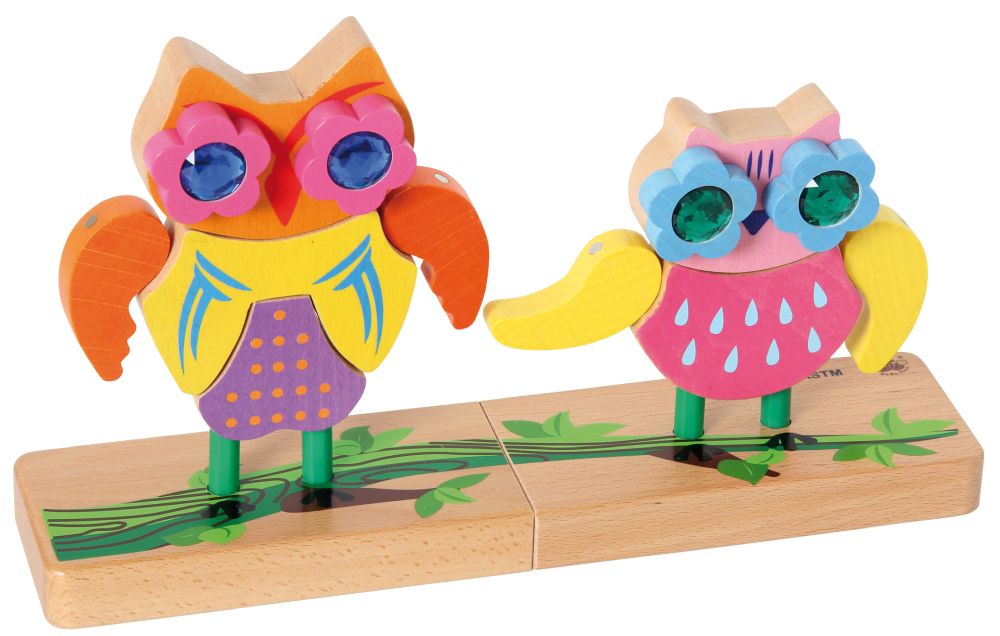 Zuordnungsspiel mit vielen bunten Holzteilen zum Gestalten vorgegebener und eigener Eulen, alleine oder zu zweit. 30×7,3×17
