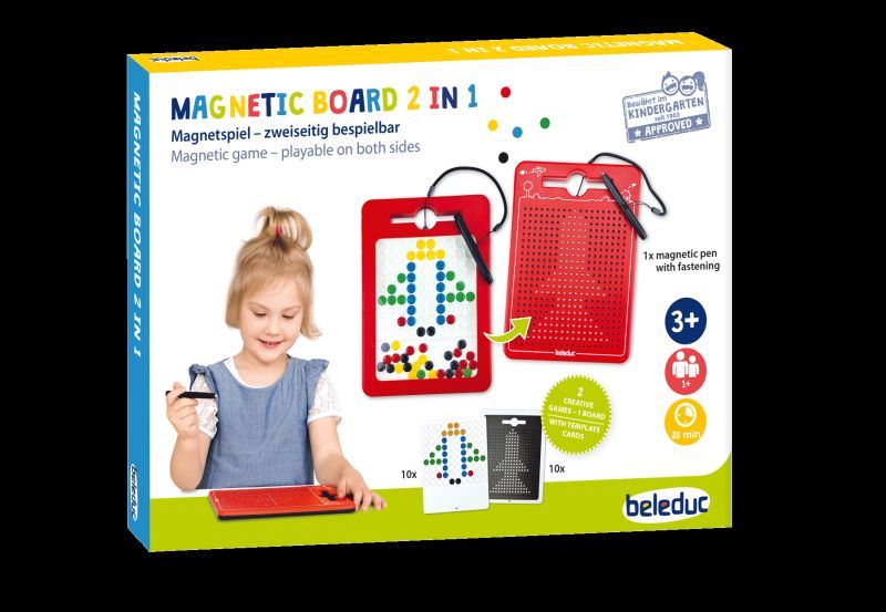Mit dem magischen Stift werden die versteckten Kugeln sichtbar gemacht, so entstehen wie von Zauberhand tolle Kunstwerke. Für neue kreative Bilder werden die Kugeln einfach wieder weggewischt und verschwinden, sicher aufbewahrt im Spielbrett. Mit dem Magnetspiel auf der anderen Seite lassen sich durch die vielen bunten Steine tolle Bilder erschaffen. 10 Vorlagekarten (beids. bedruckt) sind im Set enthalten.