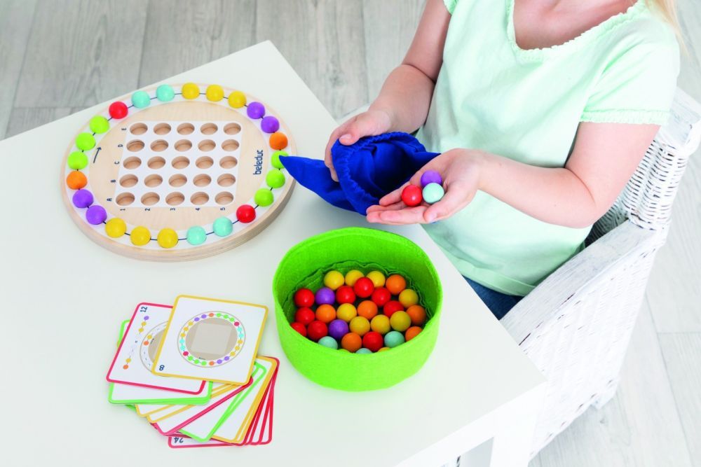 Kinder können die unterschiedlichen Aufgaben lösen oder selbst kreative Muster legen. Alle Aufgaben können auch als Kommunikationsspiel gespielt werden, indem sich die Kinder gegenseitig die Aufgaben beschreiben. Das Holz-Spielbrett hat einen inneren und äußeren Bereich, der jeweils entweder für Muster- oder für Reihenfolgen-Aufgaben genutzt werden kann.