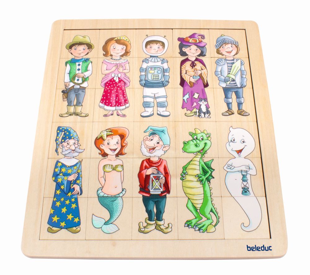 30 Teile aus Holz. Mit diesem lustigen Puzzle ist alles möglich. Fantasiefiguren anhand ihrer Kleidung puzzlen oder ganz neue Figuren kreiren. (Maße: 28,9 x 33,6 x 0,9cm)