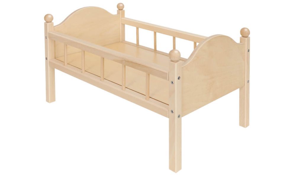 Die Holzstreben an den Seiten sorgen für eine stabile Konstruktion und verhindern, dass die Puppe aus dem Bett fällt. Farbe: natur. Ohne Bettzeug. (Maße: 54 x 29 x 25 cm)