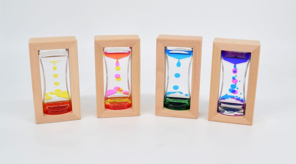 1 Stück Flüssige Sanduhren haben eine beruhigende Wirkung. Keine Farbauswahl möglich! (Maße: 8,2x4x15,5 cm, Material: Holz, Acryl, Wasser-Öl-Gemisch)