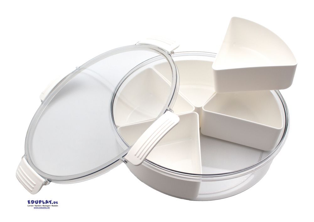 Das Set enthält 6 Schalen (1x groß, 5x dreieckig) u. 1x transparenten Deckel zum Verschließen (auch zum Spielen und Sortieren)(Maße: 26 x 26 x 8 cm, Material: Kunststoff)
