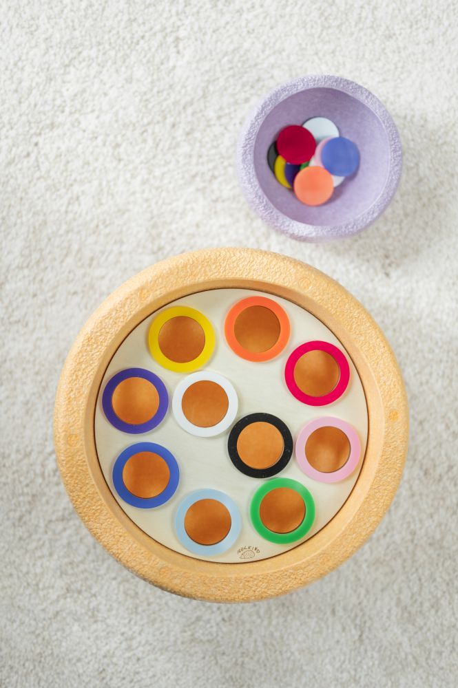Mit der Sortierfarbenplatte wird das Farbenkennenlernen und -benennen zum Kinderspiel. Die Kinder können Farbchips oder verschiedene bunte Materialien wie zum Beispiel Quetschiestöpsel, Flaschendeckel, bunte Holzstäbchen oder Pompons den jeweiligen Farben zuordnen.