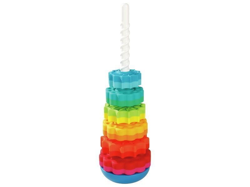 Ein farbiger Räderwerk-Turm, der schnell und langsam um seine Basis kreist. Mit 6 bunten Rädern in versch. Größen. (H: 41 cm – Ø 13,5 cm)