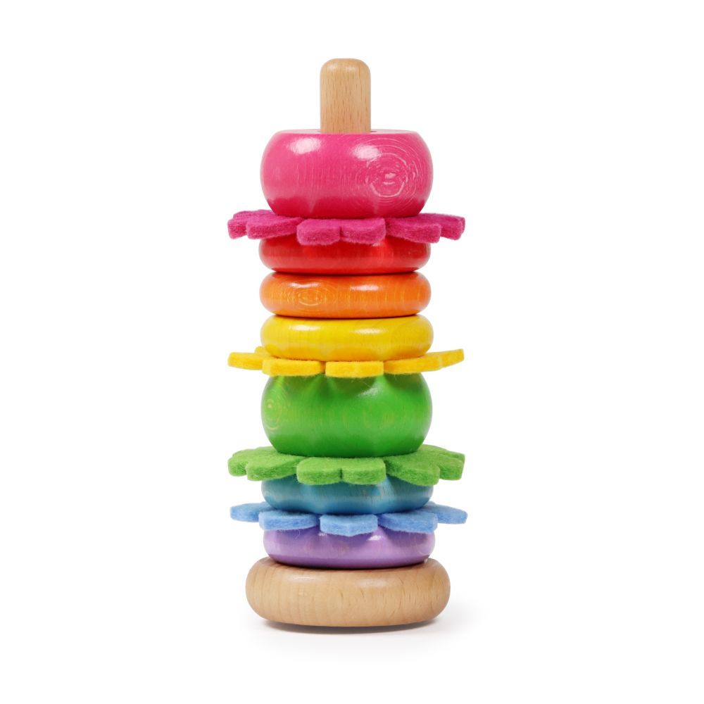 Inhalt:1 Sockel, 1 abgerundeter Stab, 2 dicke, farbige Scheiben und 5 dünne, farbige Scheiben aus Buchenholz, 4 Blüten zum Stecken aus Schafwollfilz