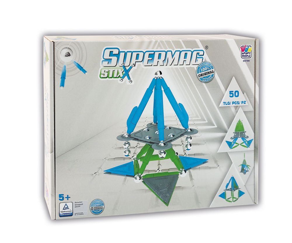 Supermag ist ein patentiertes Magnetspielzeug und bietet unendliche Baumöglichkeiten. Set aus 50 Teilen (Stäbe, Kugeln, Clips, Dreiecke,…)