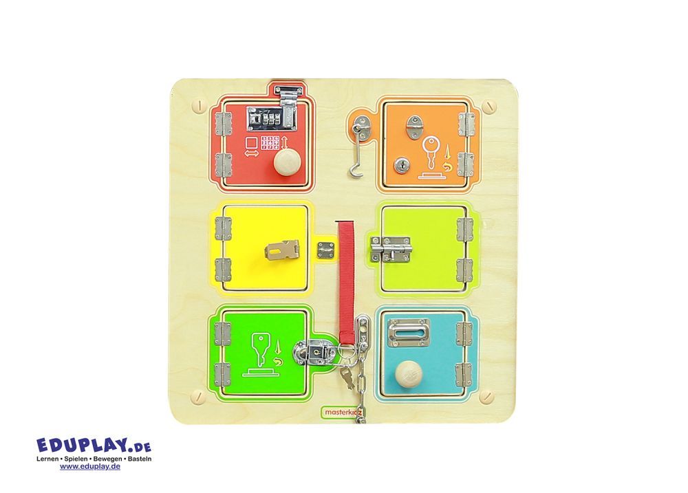 Schlösser öffnen und entdecken, was sich dahinter versteckt! Hinter jeder Tür befindet sich Platz für kleine Bilder oder Fotos – ideal für Memory-Spiele, Überraschungen oder kleine Botschaften. Die Oberfläche unter den Türen ist abwischbar, sodass Symbole oder Namen ergänzt werdenkönnen. Beim Knacken der Schlösser trainieren Kinder Feinmotorik, Handkraft und Geduld und machen gleichzeitig wichtige Alltagserfahrungen im Umgang mit echten Verschlüssen. Das spielerische Suchen und Finden fördert außerdem Konzentration und Erinnerungsvermögen.
