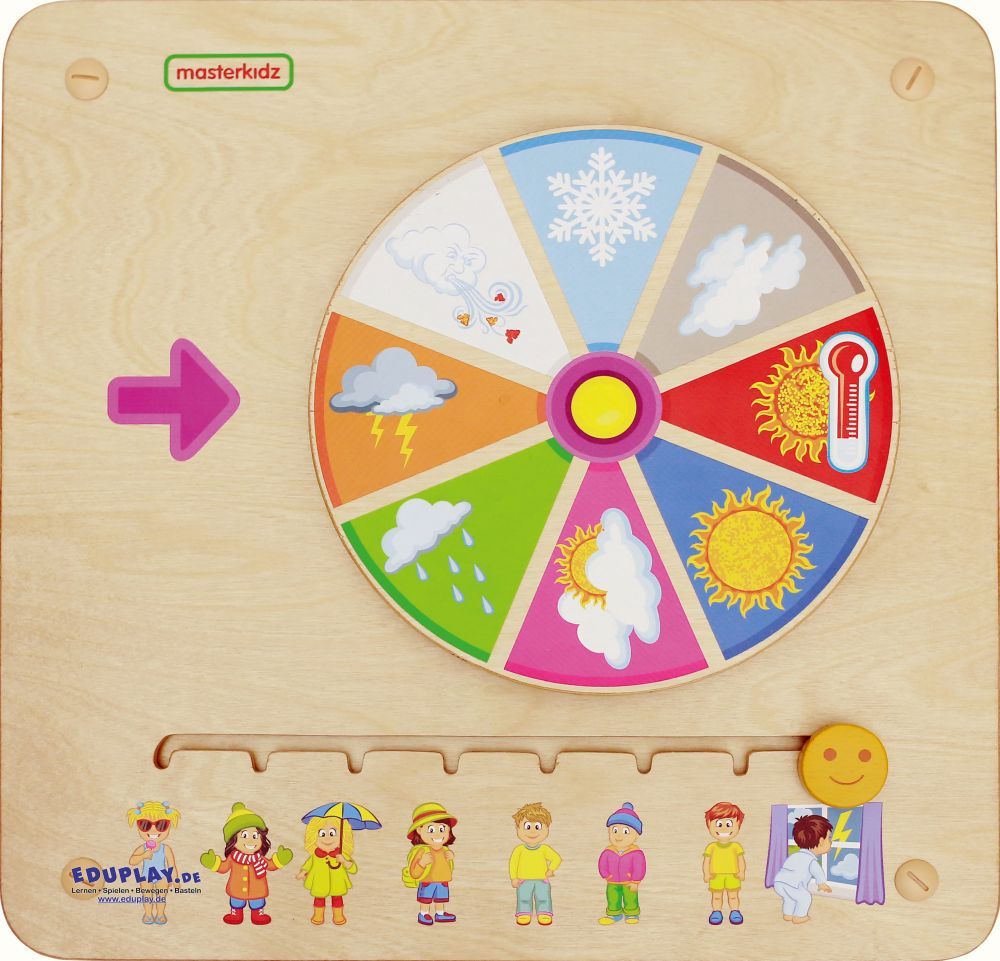 Mit diesem liebevoll illustrierten Wandelement entdecken Kinder täglich aufs Neue das Wetter. Welche Kleidung passt zu welchem Wetter? Badehose, Mütze oder Regenschirm? Die fröhlichen Figuren helfen beim Zuordnen und Benennen. So entwickeln Kinder ein erstes Verständnis für Wetterphänomene, erweitern ihren Wortschatz und üben alltagsnahe Entscheidungen – ideal für den Morgenkreis oder kleine Gesprächsrunden.